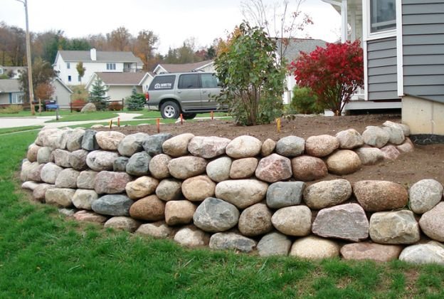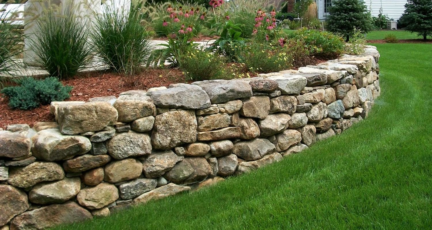 No matter what method of retaining wall construction, the basis is the same. A stone retaining wall utilizes mass and proper drainage to hold the earth back, and let water through. A good retaining wall has a solid foundation that goes below grade, adequate mass, well drained backing, and through stones that tie into the earth behind it. Certain considerations have to made depending on the height of the wall and existing soils to ensure that your retaining wall will look great and last a lifetime.